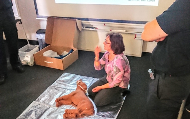 Der theoretische Teil wird immer wieder durch pratische Übungen unterstützt und aufgelockert. Sie lernen an der Hunde-Erste-Hilfe-Puppe Puls fühlen, Beatmung und Herzdruckmassage (Wiederbelebung), Eigenschutz und legen selbst Verbände an. Zwischendurch ist immer Zeit für Ihre persönlichen Fragen.